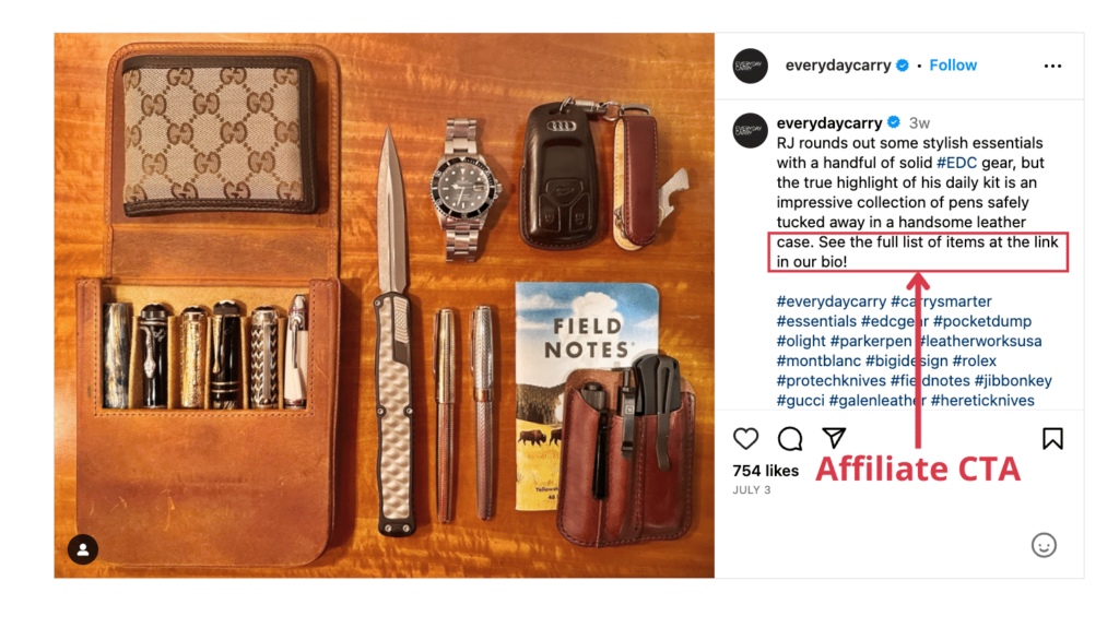 For example, the folks at Everyday Carry use Instagram-worthy images to draw visitors to their posts, then add simple calls to action in their Instagram captions, prompting followers to explore their products via the link in their bio.
