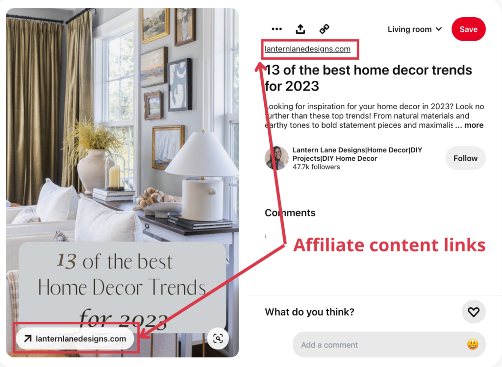 It’s also super easy to add affiliate links on Pinterest. For instance, this post from Lantern Lane Designs contains two links to a buying guide on their blog: