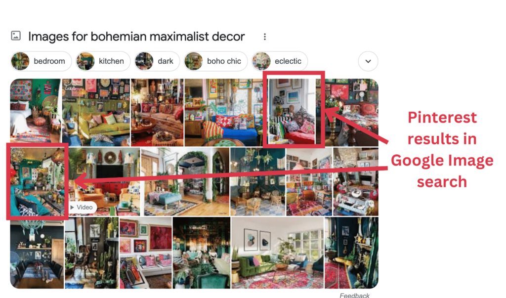 Google prioritizes imagery in searches about visual subjects (i.e. the types of topics that are best suited to Pinterest). Look at how imagery dominates the top of the SERP for this query: