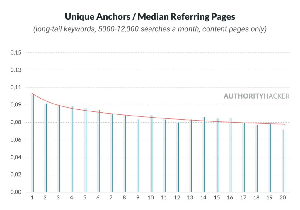 So, we divided the median of unique anchors per search rank by the median number of backlinks. We did the same with referring pages too.