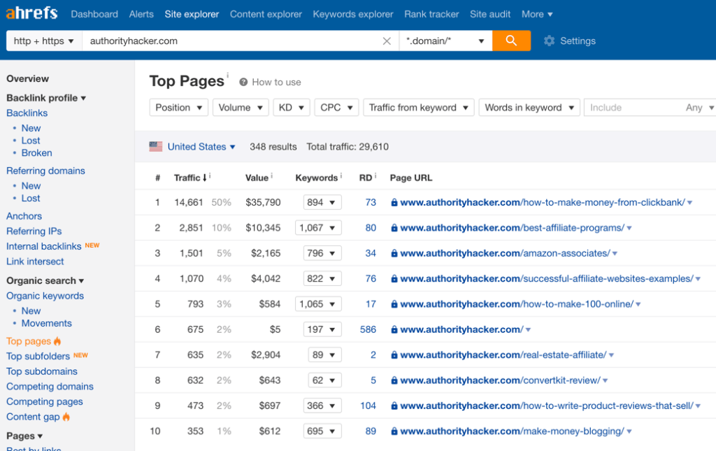 To run a quick analysis, you can use Ahrefs -> Site Explorer -> Top Pages: