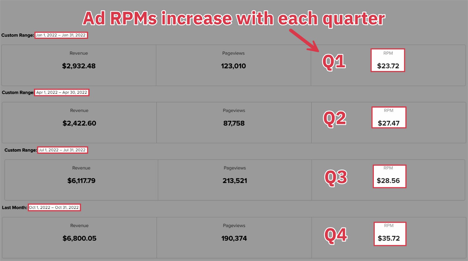 - Seasonality: Ad earnings fluctuate depending on the time of year. Sites earn the least in Q1 and the most in Q4.