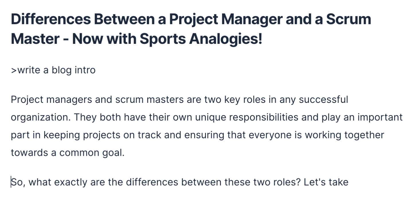 And AI writing can’t get easier than just typing: >write a blog intro and get it back for it.